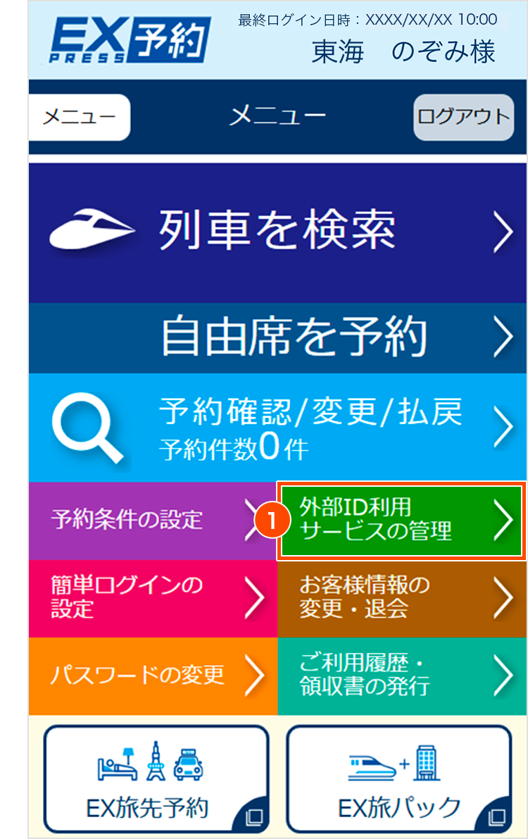 EXアプリをご利用の場合は、ログイン後の右上の「」アカウントメニューから「外部ID利用サービス」をタップしてください。