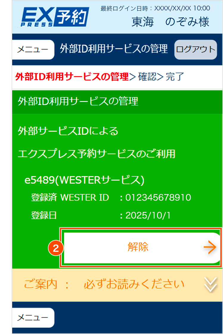 - 解除すると、外部IDでエクスプレス予約にログインすることができなくなります。