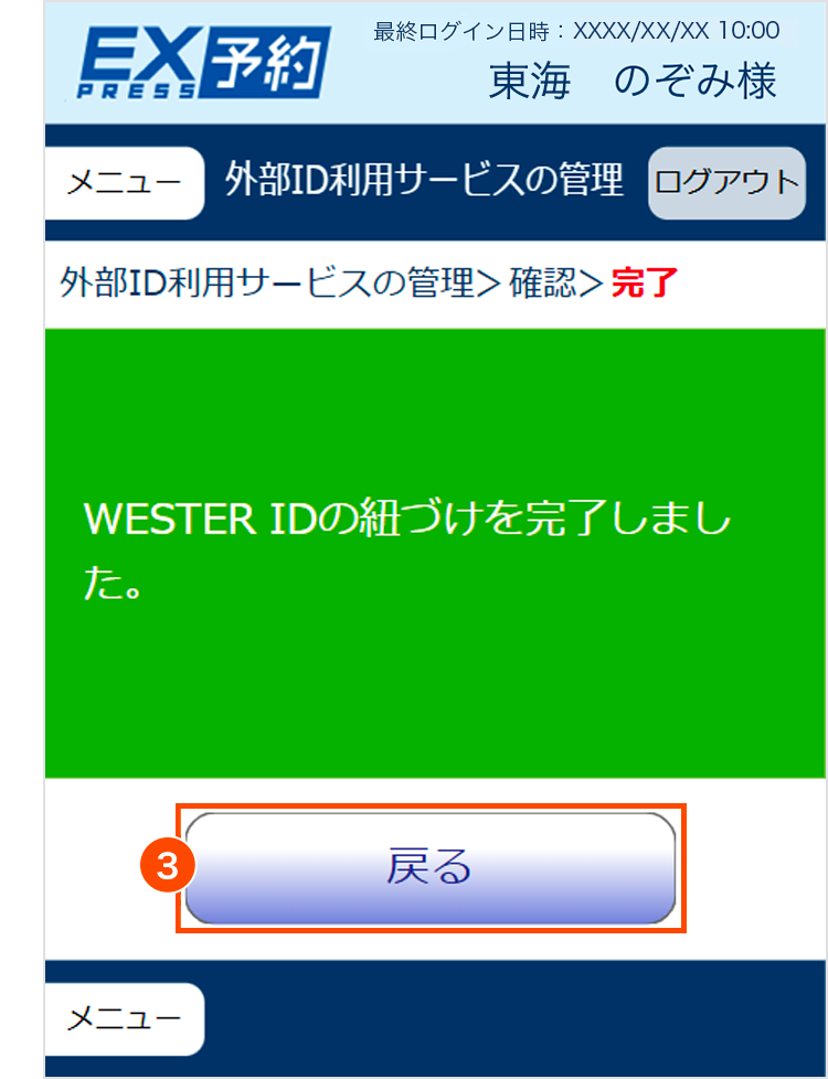 EX会員IDでe5489を利用したい方、またエクスプレス予約にて山陽新幹線をご利用になり、WESTERポイントを貯められたい方はこちらより外部ID利用サービスへご登録をお願いします。 - 会員様のご契約モデルによっては、外部ID利用サービスをご利用いただけない場合もございます。